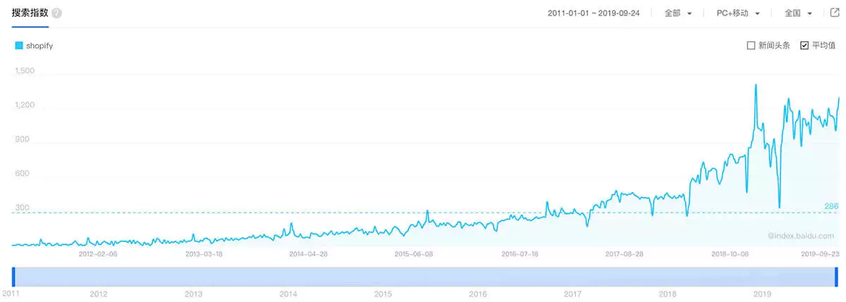 这张图是Shopify在百度指数上,从2011年到2020年在中国的搜索趋势。