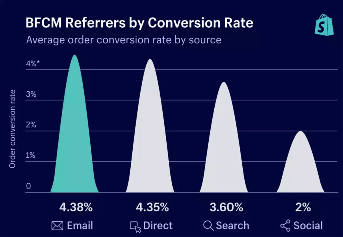上两张图,一张图是Shopify2018年BFCM期间各个流量渠道的转化率对比。可以看到至少在BFCM期间,邮件营销的转化率是最高的。(关于BFCM可以查看 – 《独立站卖家如何备战黑五网一》)