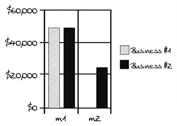 另外一张图则来自于最近看的一本书里面的一个截图,为了更好的说明问题,我们暂且片面的举例为,Business #1(Amazon)通过借助平台的流量资源,而Business #2(独立站)通过猛打Facebook广告,在第一个月M1都达到了50000美金的销售额。在第二个月,Business #1和Business #2都在失去获取新的流量来源的情况下,比方说,Business #1(Amazon)的账户被封,因为没有办法再获取新的流量,而导致销售额马上变成了0;Business #2(独立站)的FB广告被封,虽然和Business #1(Amazon)面临同样的窘境,但是Business #2凭借它在M1沉淀下来的客户信息资源,使用邮件营销也可以让第二个月有很好的销售额。