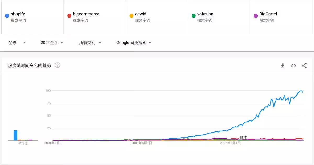 这张是Shopify在Google Trends上,从2004年到2020年在全球市场上的热度趋势