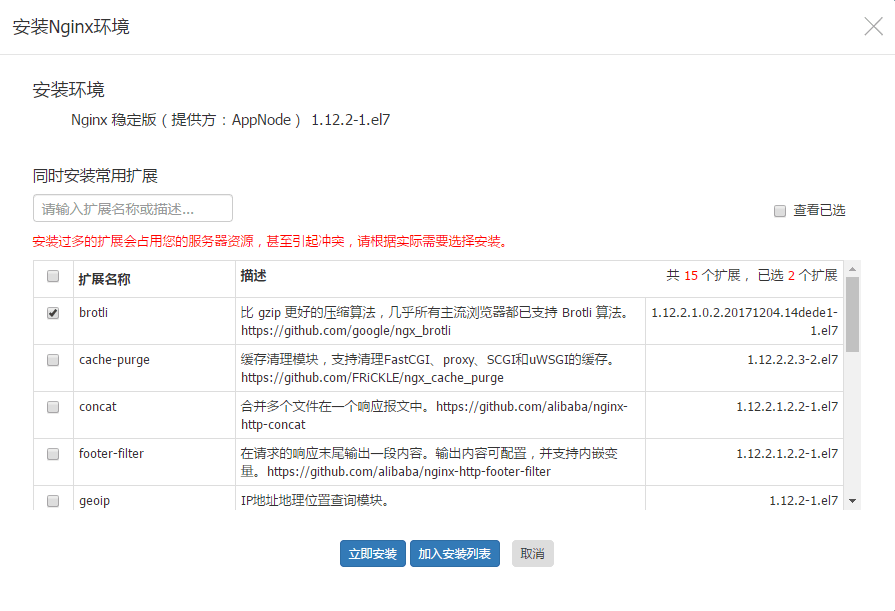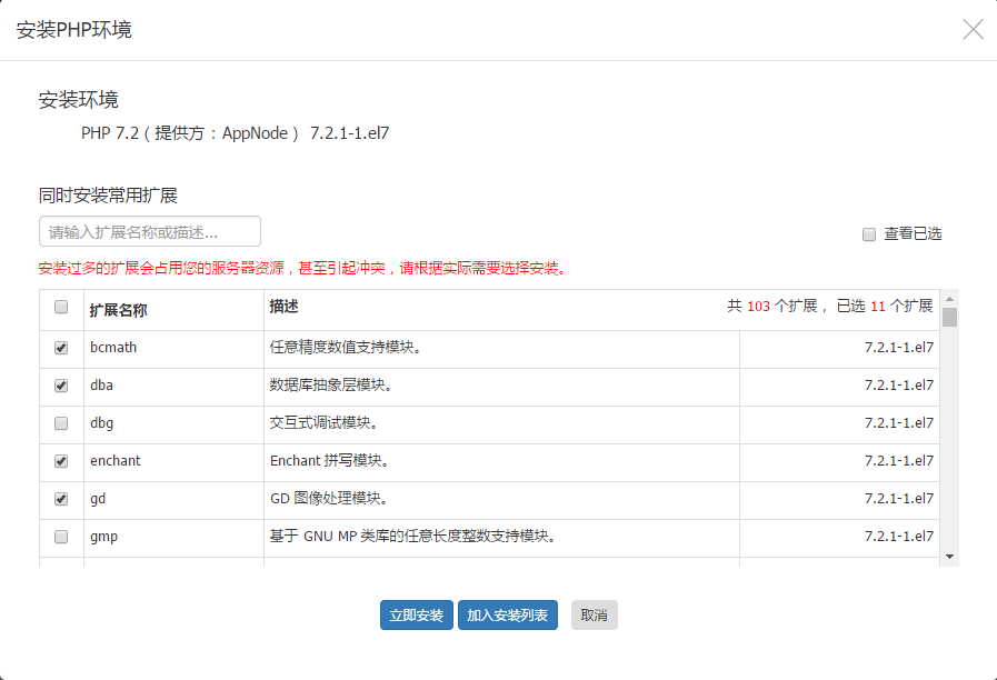 APPNODE为选择安装PHP7.2的用户 默认勾选了11个常用扩展,我们这里建立一个普通论坛,使用APPNODE默认推荐的就可以。请一定要按需安装拓展,多个拓展会造成冲突,比如我之前就测试全部拓展都安装,那根本就安装不上.
