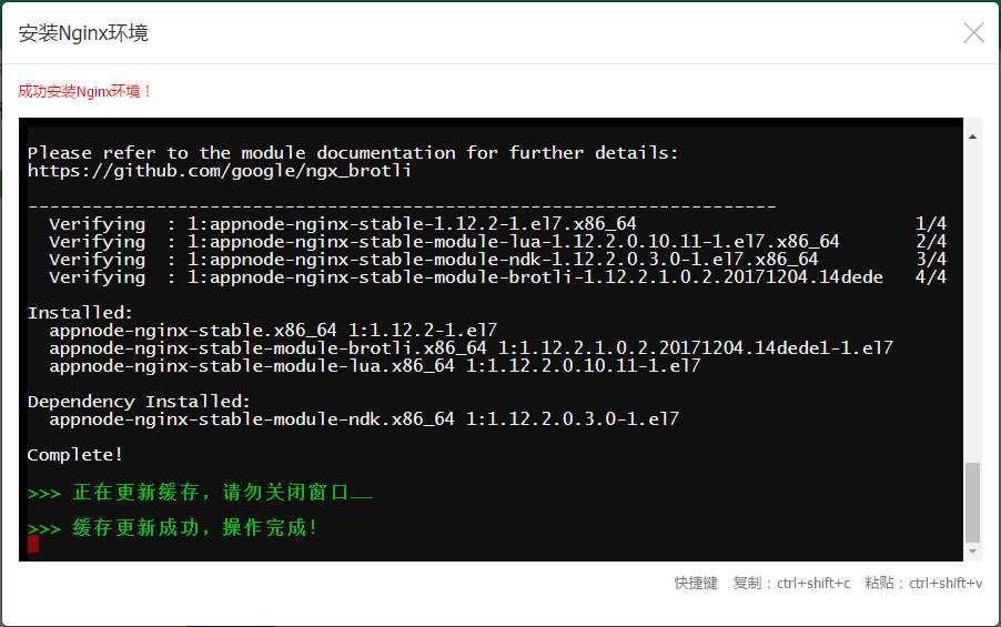 熟悉的安装成功界面,继续安装Nginx。这里一定要安装lua拓展 否则APPNODE带的CC防护功能将不能够生效.当然 你不用这个功能的话 可以不装。