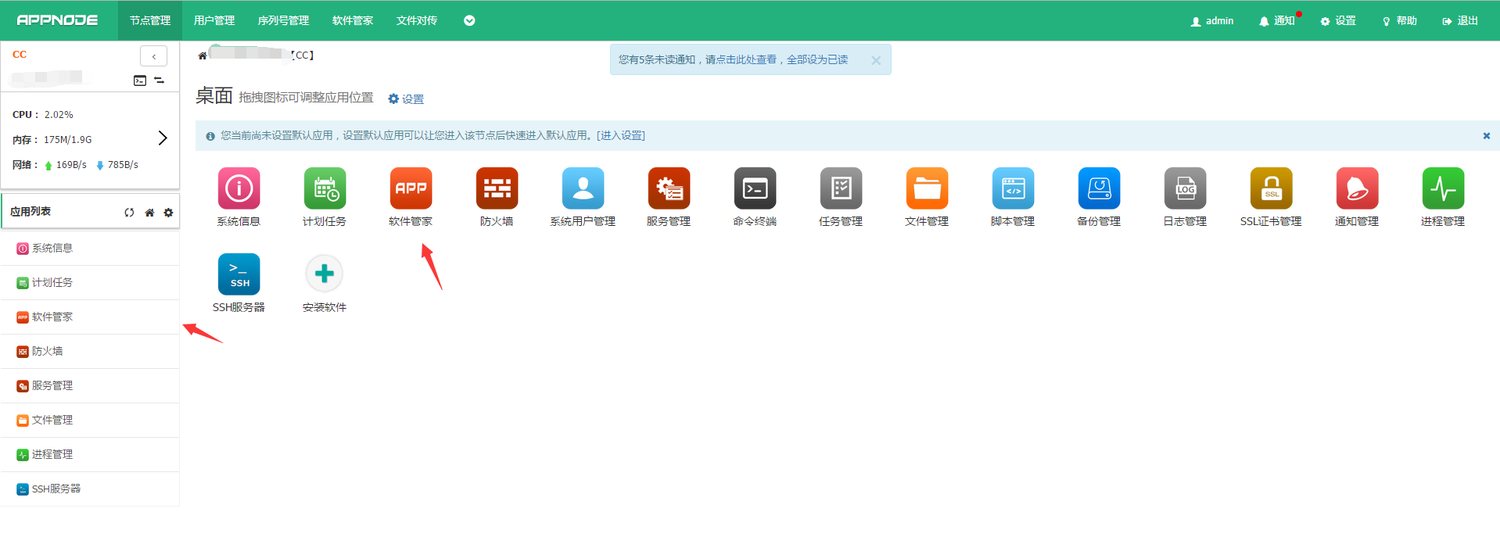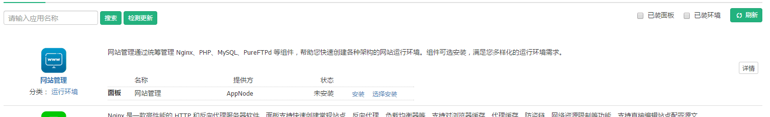 如图所示,软件管家里面的软件 带有面板字样的 代表APPNODE都为其创造了图形化界面(面板)。
