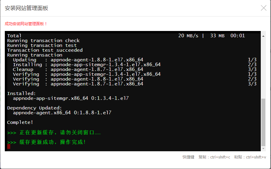 出现下图所示,即代表安装成功。注意:安装过程中请不要关闭浏览器,然后更新缓存时候也不要关闭窗口