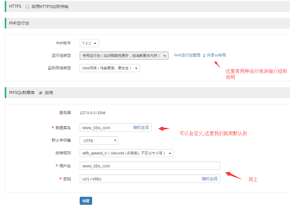 可能有小伙伴已经发现 有两个选项默认打勾了,这里说一句题外话,APPNODE创建网站 不止有网站管理 这里可以创建网站, APPNODE为Nginx,PHP,PureFTPd都有提供面板,这些面板需要有基础的站长才可以使用.