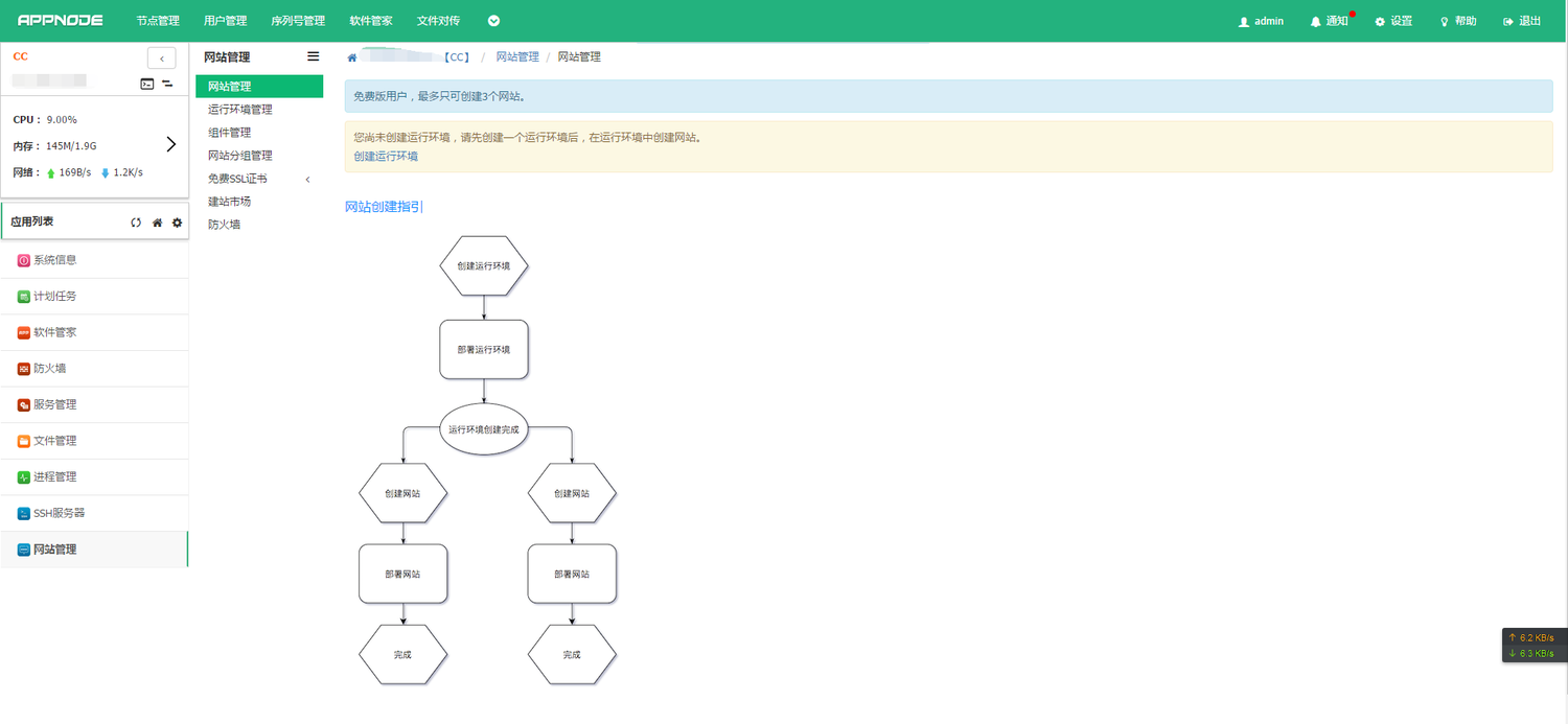 AppNode不足之处就是免费版本限制为只能建立3个站点,这个对于个人用户来说基本上没有什么影响,一般来说在一个1GB内存的VPS上跑AppNode然后再跑一个网站,内存基本上是吃完了。如果需要不限制建站的,可以看看服务器控制面板榜单。