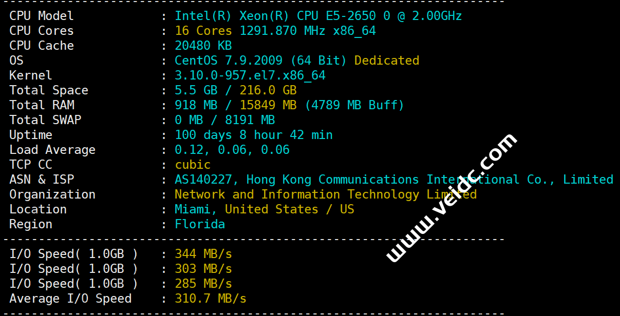 以下内容为测评华纳云香港服务器结果,测试机器:CPU为e5-2650、16G内存、240G SSD、10M带宽、3个IPv4,平均硬盘I/O在310MB,IP是香港联合国际通讯有限公司AS下的。华纳云官网型号为:HK1,立即订购>>
