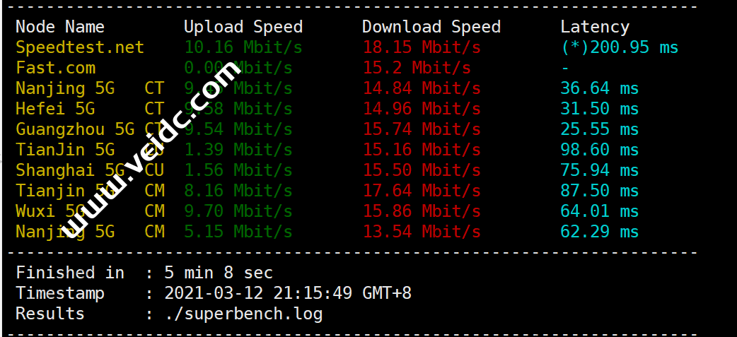 国内节点测试服务器上行和下行带宽:从数据来看上行10M,下行实际可能接近20Mbps,测试时间是晚高峰21点15分。