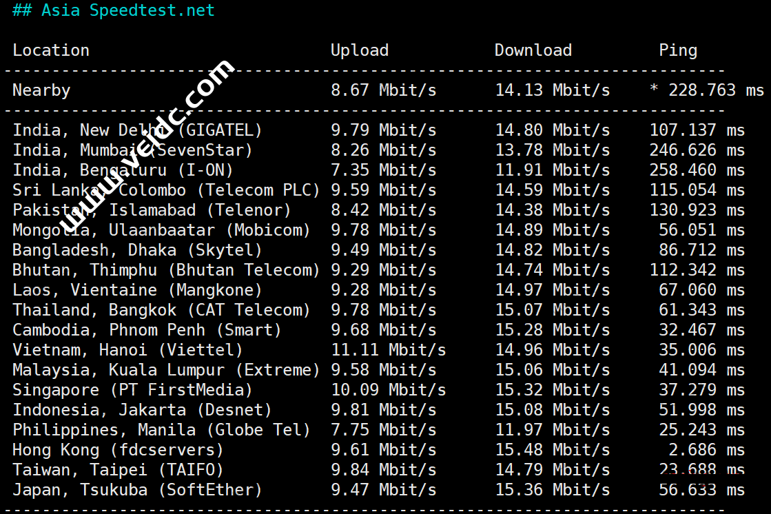 跑亚洲区域内的国家和地区,上行基本接近跑满10Mbps,下行接近15Mbps: