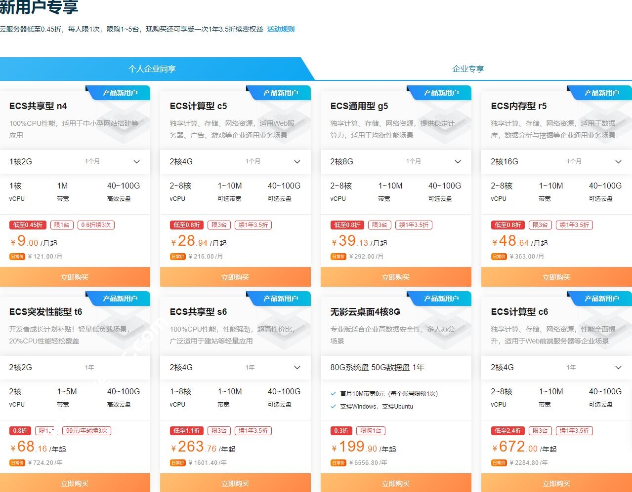 新用户云服务器低至45元,比如上面的38元年付云服务器抢不到,那就45元也亏不了多少。企业用户力度更低一些。