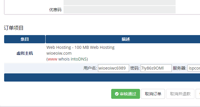 提交订单后,根据你在产品接口中设置的产品购买开通策略,由管理员人工审核开通的可以在WHMCS后台点击开通。