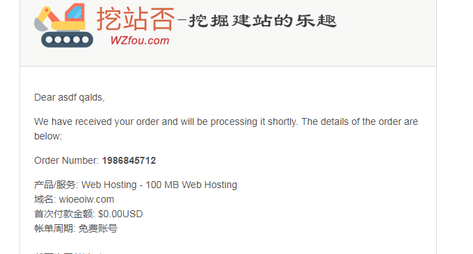 用户收到WHMCS发来的空间开通邮件。