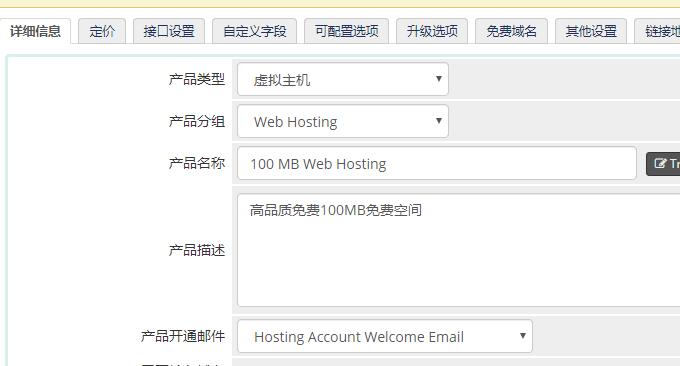 虚拟主机中就可以新建产品,填写空间的基本信息,包括配置、定价、接口设置等。