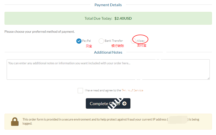 有paypal、银行卡转账和支付宝三种方式,我们选择最后的支付宝,点击complete order创建订单开始支付(必须国内IP,严禁使用代理)