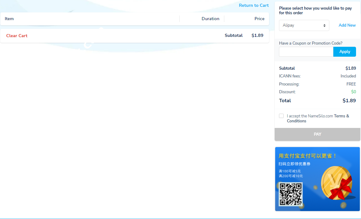 此时我们看到了图上出现了支付方式的选项也就是支付宝,下面也出现了支付宝支付的优惠券广告。确认没问题之后在 I accept the Namesilo Terms&Conditions(我同意协议条款)打钩,然后点击 PAY 按钮开始支付(付费完成后即可购买和续费该域名)