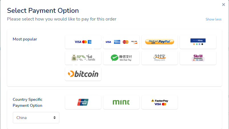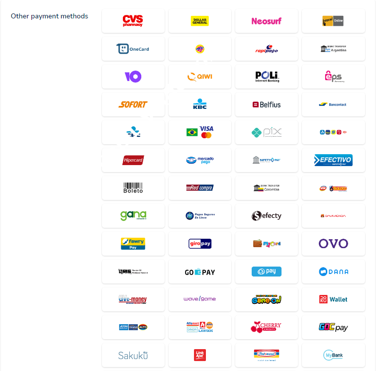 接下来是新版支付方式选择页,一般会根据用户所在国自动选择一批该国的支付方式,图上是中国的一些支付方式,一般我们用支付宝/微信/银联的巨多