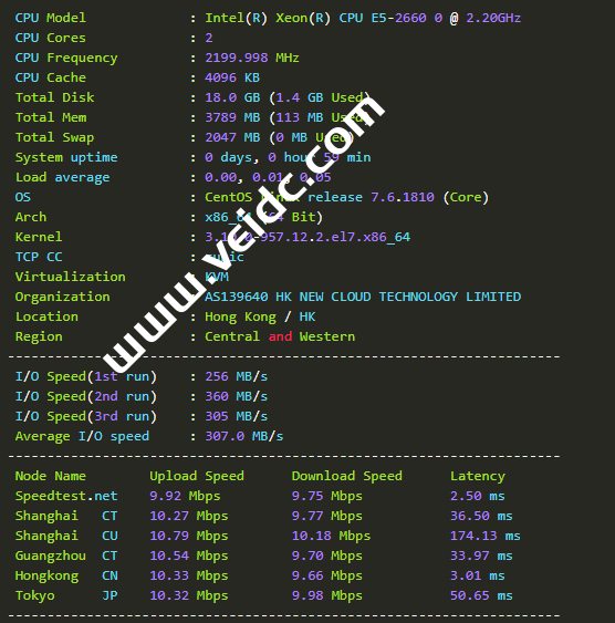 测试机器为官方销售的18元同款机器:点击查看,香港Ceranetwork 数据中心 , CN2+CMI 混合BGP,针对大陆优化,高性能E5处理器!DDOS空路由时间为2小时 本区如机房遭受攻击会部分线路绕美国清洗 测试站点 http://dc1.hk.server.idc.ax/