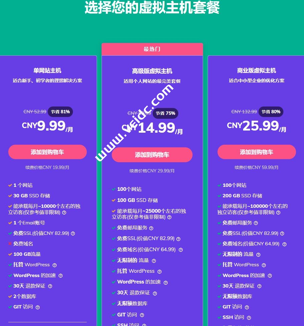 我们可以看到虚拟主机的三个方案,第一个方案只能搭建一个站点,一般不选择,第二个方案比较有性价比的。