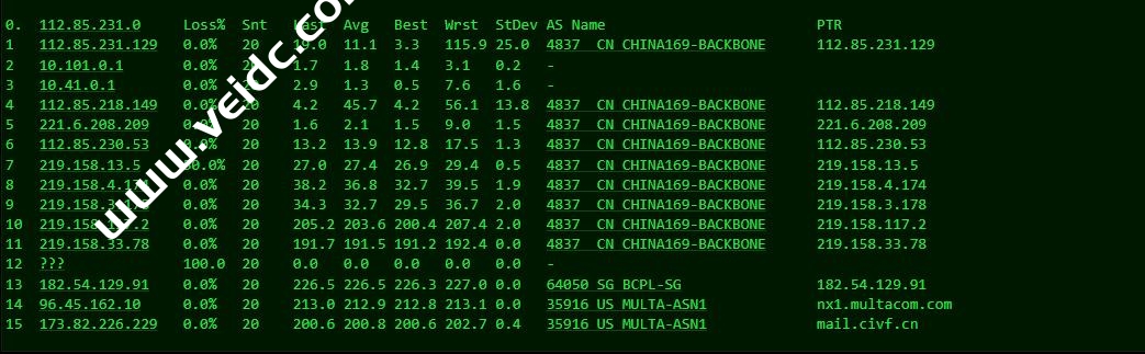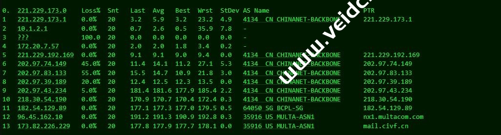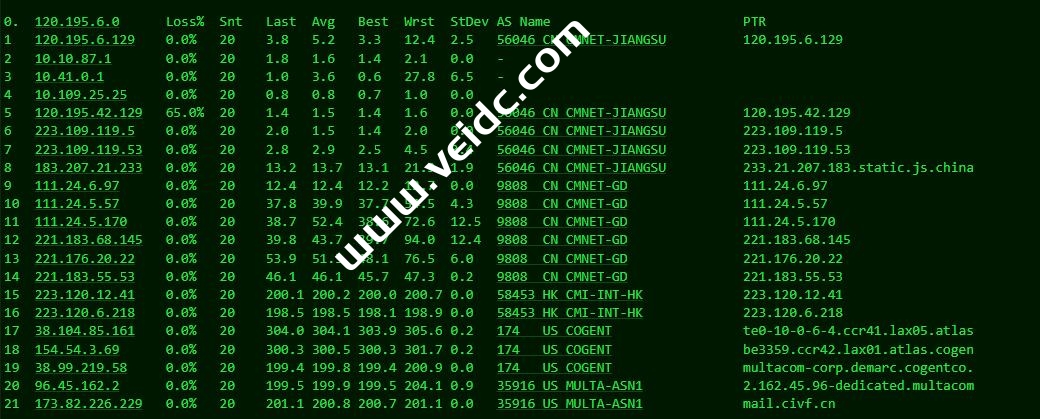 [Info] 测试路由 到 上海电信(天翼云) 中 ... traceroute to 101.227.255.45 (101.227.255.45), 30 hops max, 32 byte packets 1 1-226-82-173-dedicated.multacom.com (173.82.226.1) 0.78 ms AS35916 美国, 加利福尼亚州, 洛杉矶, multacom.com 2 multacom.com (96.45.162.9) 1.16 ms AS35916 美国, 加利福尼亚州, 洛杉矶, multacom.com 3 182.54.129.88 0.53 ms AS64050 美国, 加利福尼亚州, 洛杉矶, bgp.net 4 218.30.54.189 0.68 ms AS4134 美国, chinatelecom.com.cn, 电信 5 * 6 202.97.12.185 173.59 ms AS4134 中国, 上海, chinatelecom.com.cn, 电信 7 * 8 * 9 * 10 * 11 * 12 * 13 * 14 * 15 * 16 * 17 * 18 * 19 * 20 * 21 * 22 * 23 * 24 * 25 * 26 * 27 * 28 * 29 * 30 * [Info] 测试路由 到 上海电信(天翼云) 完成 ! [Info] 测试路由 到 厦门电信CN2 中 ... traceroute to 117.28.254.129 (117.28.254.129), 30 hops max, 32 byte packets 1 1-226-82-173-dedicated.multacom.com (173.82.226.1) 0.82 ms AS35916 美国, 加利福尼亚州, 洛杉矶, multacom.com 2 multacom.com (96.45.162.9) 0.85 ms AS35916 美国, 加利福尼亚州, 洛杉矶, multacom.com 3 ae-41.a00.lsanca07.us.bb.gin.ntt.net (129.250.205.121) 0.65 ms AS2914 美国, 加利福尼亚州, 洛杉矶, ntt.com 4 ae-9.r25.lsanca07.us.bb.gin.ntt.net (129.250.2.117) 3.35 ms AS2914 美国, 加利福尼亚州, 洛杉矶, ntt.com 5 ae-12.r31.tokyjp05.jp.bb.gin.ntt.net (129.250.3.192) 102.98 ms AS2914 日本, 东京都, 东京, ntt.com 6 ae-1.a01.tokyjp09.jp.bb.gin.ntt.net (129.250.7.62) 107.90 ms AS2914 日本, 东京都, 东京, ntt.com 7 xe-1-4-0-1.a01.tokyjp09.jp.ce.gin.ntt.net (117.103.177.106) 107.58 ms AS2914 日本, 东京都, 东京, ntt.com 8 59.43.186.185 134.19 ms * 中国, 上海, chinatelecom.com.cn, 电信 9 * 10 59.43.130.213 143.75 ms * 中国, 上海, chinatelecom.com.cn, 电信 11 59.43.138.186 205.36 ms * 中国, 福建, chinatelecom.com.cn, 电信 12 * 13 * 14 * 15 117.28.254.129 207.13 ms AS4809 中国, 福建, 厦门, chinatelecom.com.cn, 电信 [Info] 测试路由 到 厦门电信CN2 完成 ! [Info] 测试路由 到 浙江杭州联通 中 ... traceroute to 101.71.241.238 (101.71.241.238), 30 hops max, 32 byte packets 1 1-226-82-173-dedicated.multacom.com (173.82.226.1) 11.22 ms AS35916 美国, 加利福尼亚州, 洛杉矶, multacom.com 2 multacom.com (96.45.162.9) 0.75 ms AS35916 美国, 加利福尼亚州, 洛杉矶, multacom.com 3 los-edge-07.inet.qwest.net (65.153.29.221) 0.41 ms AS209 美国, 加利福尼亚州, 洛杉矶, centurylink.com 4 los-edge-08.inet.qwest.net (67.14.22.202) 0.50 ms AS209,AS6223,AS6224 美国, 加利福尼亚州, 洛杉矶, centurylink.com 5 * 6 4.69.209.165 8.62 ms AS3356 美国, 加利福尼亚州, 圣何塞, level3.com 7 CHINA-UNICO.edge1.SanJose3.Level3.net (4.53.209.78) 176.63 ms AS3356 美国, 加利福尼亚州, 圣何塞, level3.com 8 219.158.116.237 186.43 ms AS4837 中国, 上海, chinaunicom.com, 联通 9 219.158.19.78 196.22 ms AS4837 中国, 上海, chinaunicom.com, 联通 10 219.158.19.81 161.63 ms AS4837 中国, 上海, chinaunicom.com, 联通 11 219.158.106.122 171.81 ms AS4837 中国, 浙江, 杭州, chinaunicom.com, 联通 12 101.71.244.90 172.26 ms AS4837 中国, 浙江, 杭州, chinaunicom.com, 联通 13 * 14 * 15 * 16 * 17 * 18 * 19 * 20 * 21 * 22 * 23 * 24 * 25 * 26 * 27 * 28 * 29 * 30 * [Info] 测试路由 到 浙江杭州联通 完成 ! [Info] 测试路由 到 浙江杭州移动 中 ... traceroute to 112.17.0.106 (112.17.0.106), 30 hops max, 32 byte packets 1 1-226-82-173-dedicated.multacom.com (173.82.226.1) 0.80 ms AS35916 美国, 加利福尼亚州, 洛杉矶, multacom.com 2 multacom.com (96.45.162.9) 1.30 ms AS35916 美国, 加利福尼亚州, 洛杉矶, multacom.com 3 china-mobile.as58453.any2ix.coresite.com (206.72.210.219) 0.90 ms AS9009 美国, 加利福尼亚州, 洛杉矶, coresite.com 4 223.120.6.17 1.02 ms AS58453 美国, 加利福尼亚州, 洛杉矶, chinamobile.com, 移动 5 223.120.13.46 181.75 ms AS58453 中国, 上海, chinamobile.com, 移动 6 221.183.55.30 181.54 ms AS9808 中国, 上海, chinamobile.com, 移动 7 221.183.25.189 190.37 ms AS9808 中国, 上海, chinamobile.com, 移动 8 221.176.22.9 226.18 ms AS9808 中国, 上海, chinamobile.com, 移动 9 111.24.3.93 182.45 ms AS9808 中国, 上海, chinamobile.com, 移动 10 221.183.10.6 190.29 ms AS9808 中国, 浙江, 杭州, chinamobile.com, 移动 11 * 12 117.148.185.110 217.00 ms AS56041 中国, 浙江, 杭州, chinamobile.com, 移动 13 218.205.87.13 204.42 ms AS56041 中国, 浙江, 杭州, chinamobile.com, 移动 14 * 15 * 16 * 17 * 18 * 19 * 20 * 21 * 22 * 23 * 24 * 25 * 26 * 27 * 28 * 29 * 30 * [Info] 测试路由 到 浙江杭州移动 完成 ! [Info] 测试路由 到 北京教育网 中 ... traceroute to 202.205.6.30 (202.205.6.30), 30 hops max, 32 byte packets 1 1-226-82-173-dedicated.multacom.com (173.82.226.1) 0.83 ms AS35916 美国, 加利福尼亚州, 洛杉矶, multacom.com 2 multacom.com (96.45.162.9) 0.78 ms AS35916 美国, 加利福尼亚州, 洛杉矶, multacom.com 3 china-mobile.as58453.any2ix.coresite.com (206.72.210.219) 1.10 ms AS9009 美国, 加利福尼亚州, 洛杉矶, coresite.com 4 223.120.6.17 0.94 ms AS58453 美国, 加利福尼亚州, 洛杉矶, chinamobile.com, 移动 5 * 6 223.120.3.86 156.10 ms AS58453 中国, 香港, chinamobile.com, 移动 7 223.119.81.94 154.23 ms AS58453 中国, 香港, chinamobile.com, 移动 8 101.4.114.181 197.84 ms AS4538 中国, 北京, edu.cn, 教育网 9 * 10 * 11 101.4.118.213 189.64 ms AS4538 中国, 北京, edu.cn, 教育网 12 101.4.113.110 187.11 ms AS4538 中国, 北京, edu.cn, 教育网 13 219.224.102.230 188.83 ms AS4538 中国, 北京, edu.cn, 教育网 14 * 15 * 16 * 17 * 18 * 19 * 20 * 21 * 22 * 23 * 24 * 25 * 26 * 27 * 28 * 29 * 30 101.4.130.54 188.95 ms AS4538 中国, 北京, edu.cn, 教育网 [Info] 测试路由 到 北京教育网 完成 ! [Info] 四网路由快速测试 已完成 !