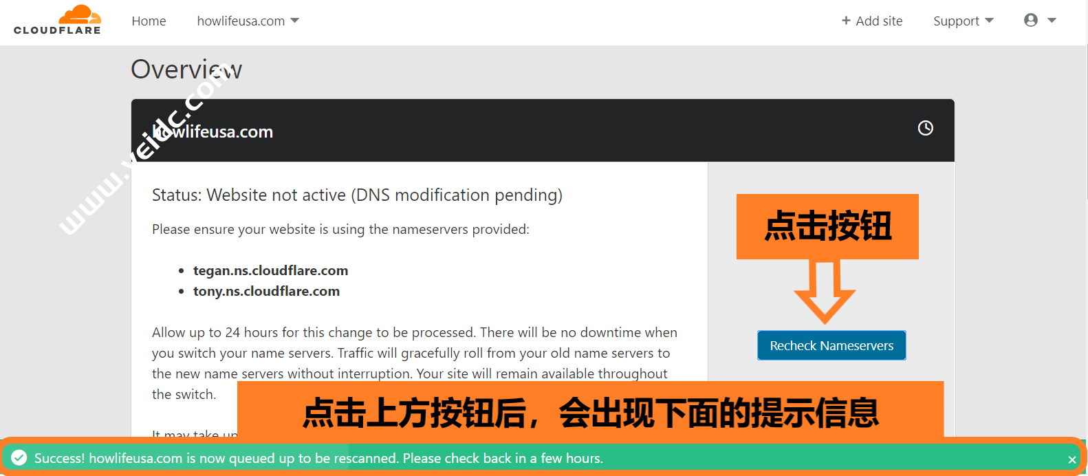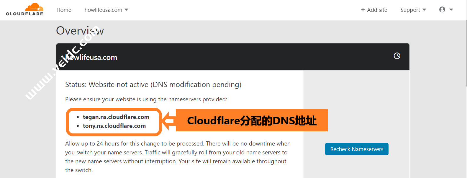 回到Cloudflare账户中,点击按钮【Recheck Nameservers】,查看是否成功完成Cloudflare DNS的设置。