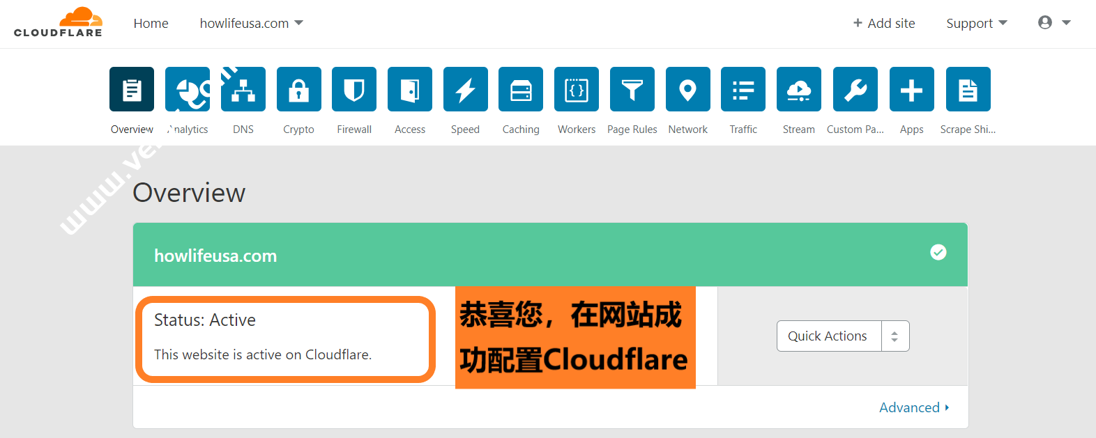 恭喜您,成功为网站配置了Cloudflare,从而提供了免费的安全保护和CDN服务!