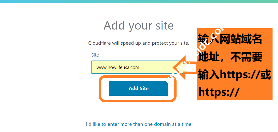 点击完成后,会弹出一个新的页面,请输入您的网站域名地址,然后点击最下方的按钮【Add Site】, 如下图所示: