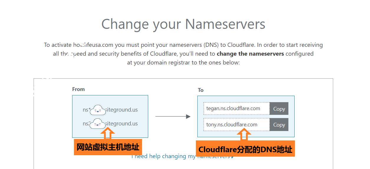 在这一步里,您会看到Cloudflare为您的网站分配了新的DNS地址,会自动将网站原先的虚拟主机地址(下图左侧)同Cloudflare分配的DNS主机(下图右侧)匹配起来。在这一步中,您不需要做任何的设置,直接点击最下端的按钮,进入下一步。