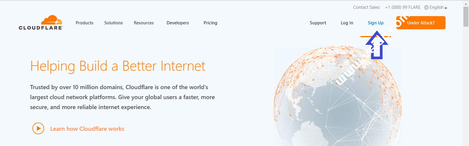 登陆Cloudflare主页,点击右上角的按钮【Sign Up】,免费注册一个新的Cloudflare账户,如下图所示。注册过程比较简单,需要输入您的姓名、地址等信息,这里我们就不多说了。