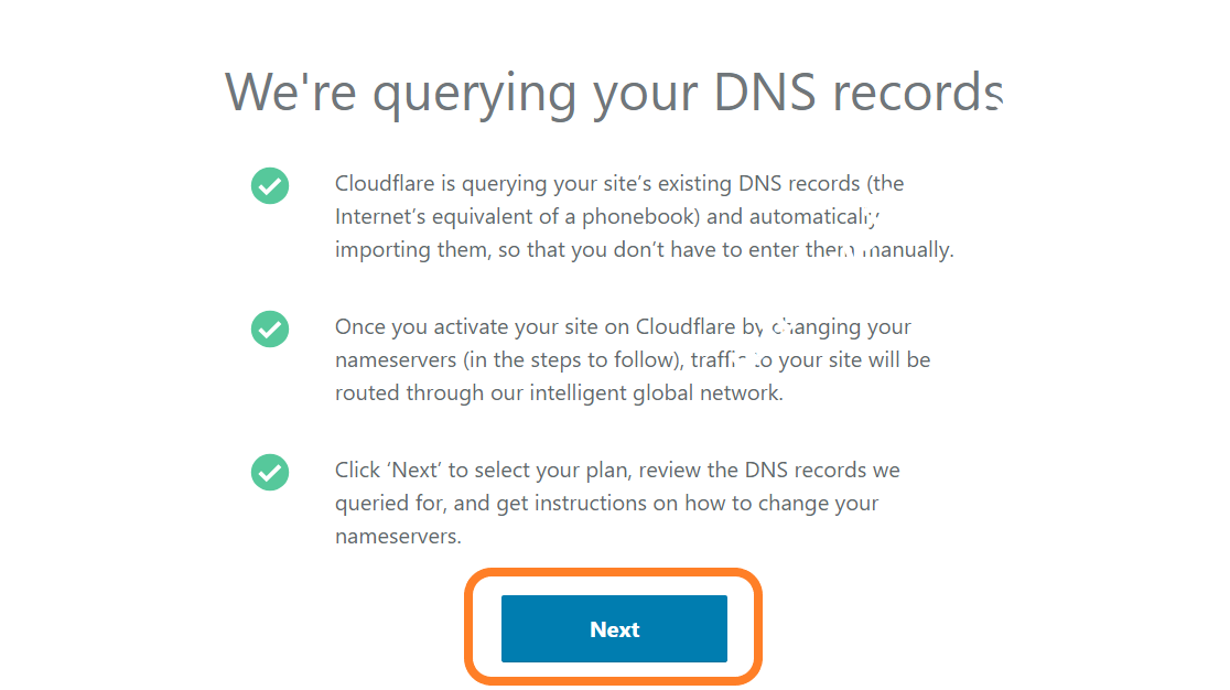 当您添加了网站域名地址,Cloudflare在下一步中会自动检索网站域名的DNS信息,在这一步里,您不需要做任何设置,请点击最下端的按钮【Next】: