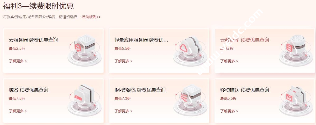 每款机型/配置/应用/域名仅限1次优惠续费,请谨慎选择时长,已经在本活动续费的产品不展示在可续费商品列表中。