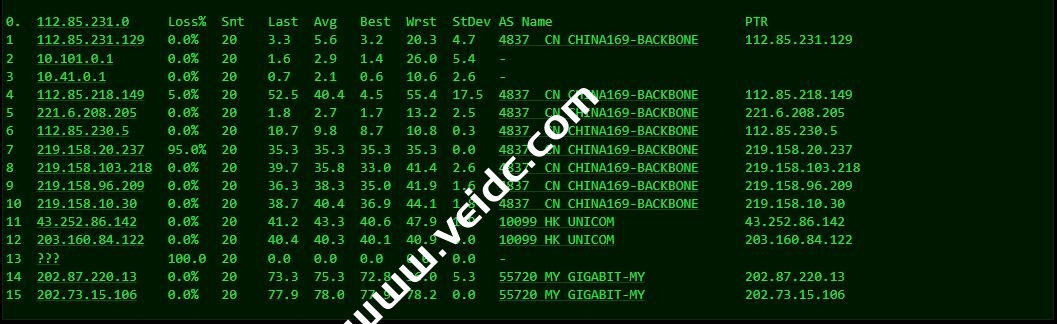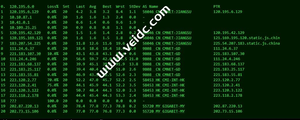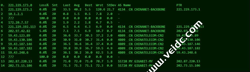 [Info] 测试路由 到 上海电信(天翼云) 中 ... traceroute to 101.227.255.45 (101.227.255.45), 30 hops max, 32 byte packets 1 202.87.223.2 3.41 ms AS55720 马来西亚, 吉隆坡联邦直辖区, thegigabit.com 2 * 3 103.106.248.17 40.56 ms * 马来西亚, 1maxhosting.com 4 59.43.250.85 39.55 ms * 新加坡, chinatelecom.com.cn, 电信 5 59.43.180.125 66.91 ms * 中国, 广东, 广州, chinatelecom.com.cn, 电信 6 * 7 59.43.130.213 73.20 ms * 中国, 上海, chinatelecom.com.cn, 电信 8 61.152.24.190 69.69 ms AS4812 中国, 上海, chinatelecom.com.cn, 电信 9 * 10 * 11 * 12 * 13 * 14 * 15 * 16 * 17 * 18 * 19 * 20 * 21 * 22 * 23 * 24 * 25 * 26 * 27 * 28 * 29 * 30 * [Info] 测试路由 到 上海电信(天翼云) 完成 ! [Info] 测试路由 到 厦门电信CN2 中 ... traceroute to 117.28.254.129 (117.28.254.129), 30 hops max, 32 byte packets 1 202.87.223.2 1.05 ms AS55720 马来西亚, 吉隆坡联邦直辖区, thegigabit.com 2 * 3 103.106.248.17 40.60 ms * 马来西亚, 1maxhosting.com 4 59.43.183.125 40.26 ms * 新加坡, chinatelecom.com.cn, 电信 5 59.43.189.205 44.95 ms * 中国, 广东, 广州, chinatelecom.com.cn, 电信 6 59.43.187.113 45.63 ms * 中国, 广东, 广州, chinatelecom.com.cn, 电信 7 59.43.130.125 46.82 ms * 中国, 广东, 广州, chinatelecom.com.cn, 电信 8 59.43.46.214 60.52 ms * 中国, 福建, chinatelecom.com.cn, 电信 9 110.80.128.94 78.17 ms AS133775 中国, 福建, 厦门, chinatelecom.com.cn, 电信 10 * 11 117.25.141.106 77.59 ms AS133775 中国, 福建, 厦门, chinatelecom.com.cn, 电信 12 117.28.254.129 65.87 ms AS4809 中国, 福建, 厦门, chinatelecom.com.cn, 电信 [Info] 测试路由 到 厦门电信CN2 完成 ! [Info] 测试路由 到 浙江杭州联通 中 ... traceroute to 101.71.241.238 (101.71.241.238), 30 hops max, 32 byte packets 1 202.87.223.2 0.69 ms AS55720 马来西亚, 吉隆坡联邦直辖区, thegigabit.com 2 * 3 202.77.19.169 34.03 ms AS10099 中国, 香港, chinaunicom.com, 联通 4 202.77.18.194 38.66 ms AS10099 中国, 香港, chinaunicom.com, 联通 5 202.77.23.25 40.63 ms AS10099 中国, 香港, chinaunicom.com, 联通 6 219.158.10.49 41.32 ms AS4837 中国, 广东, 广州, chinaunicom.com, 联通 7 219.158.103.25 44.27 ms AS4837 中国, 广东, 广州, chinaunicom.com, 联通 8 * 9 219.158.20.234 67.17 ms AS4837 中国, 浙江, 杭州, chinaunicom.com, 联通 10 101.69.245.206 64.97 ms AS4837 中国, 浙江, 杭州, chinaunicom.com, 联通 11 * 12 * 13 * 14 * 15 * 16 * 17 * 18 * 19 * 20 * 21 * 22 * 23 * 24 * 25 * 26 * 27 * 28 * 29 * 30 * [Info] 测试路由 到 浙江杭州联通 完成 ! [Info] 测试路由 到 浙江杭州移动 中 ... traceroute to 112.17.0.106 (112.17.0.106), 30 hops max, 32 byte packets 1 202.87.223.2 1.65 ms AS55720 马来西亚, 吉隆坡联邦直辖区, thegigabit.com 2 * 3 103.106.248.5 33.33 ms * 马来西亚, 1maxhosting.com 4 223.118.2.177 36.73 ms AS58453 中国, 香港, chinamobile.com, 移动 5 221.183.30.149 76.25 ms AS9808 中国, 广东, 广州, chinamobile.com, 移动 6 221.176.24.57 39.66 ms AS9808 中国, 广东, 广州, chinamobile.com, 移动 7 221.176.22.113 39.64 ms AS9808 中国, 广东, 广州, chinamobile.com, 移动 8 * 9 221.183.109.230 68.27 ms AS9808 中国, 浙江, 杭州, chinamobile.com, 移动 10 * 11 218.205.58.194 71.39 ms AS56041 中国, 浙江, 杭州, chinamobile.com, 移动 12 218.205.87.13 71.68 ms AS56041 中国, 浙江, 杭州, chinamobile.com, 移动 13 * 14 * 15 * 16 * 17 * 18 * 19 * 20 * 21 * 22 * 23 * 24 * 25 * 26 * 27 * 28 * 29 * 30 * [Info] 测试路由 到 浙江杭州移动 完成 ! [Info] 测试路由 到 北京教育网 中 ... traceroute to 202.205.6.30 (202.205.6.30), 30 hops max, 32 byte packets 1 202.87.223.2 0.63 ms AS55720 马来西亚, 吉隆坡联邦直辖区, thegigabit.com 2 * 3 cjb-r3-a73.time.net.my (203.121.81.73) 1.07 ms AS9930 马来西亚, time.com.my 4 223.28.35.230 0.35 ms AS9930 马来西亚, 吉隆坡联邦直辖区, time.com.my 5 * 6 * 7 223.28.43.66 6.55 ms AS9930 新加坡, time.com.my 8 * 9 223.28.43.254 42.28 ms AS9930 中国, 香港, time.com.my 10 cernetedu1-lacp-10g.hkix.net (123.255.91.118) 75.23 ms * 中国, 香港, hkix.net 11 101.4.114.181 78.08 ms AS4538 中国, 北京, edu.cn, 教育网 12 * 13 * 14 101.4.118.213 75.81 ms AS4538 中国, 北京, edu.cn, 教育网 15 101.4.113.110 75.39 ms AS4538 中国, 北京, edu.cn, 教育网 16 219.224.102.230 78.46 ms AS4538 中国, 北京, edu.cn, 教育网 17 * 18 * 19 * 20 101.4.130.53 78.55 ms AS4538 中国, 北京, edu.cn, 教育网 21 101.4.130.54 79.03 ms AS4538 中国, 北京, edu.cn, 教育网 22 * 23 101.4.130.54 79.75 ms AS4538 中国, 北京, edu.cn, 教育网 24 * 25 * 26 101.4.130.53 77.95 ms AS4538 中国, 北京, edu.cn, 教育网 27 * 28 * 29 * 30 * [Info] 测试路由 到 北京教育网 完成 ! [Info] 四网路由快速测试 已完成 !
