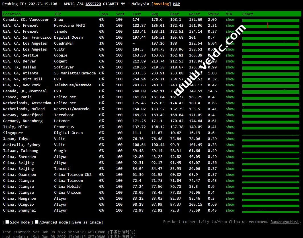 全球PING及丢包率测试,可以看到总体PING值虽然比香港高一些,但是很稳定。