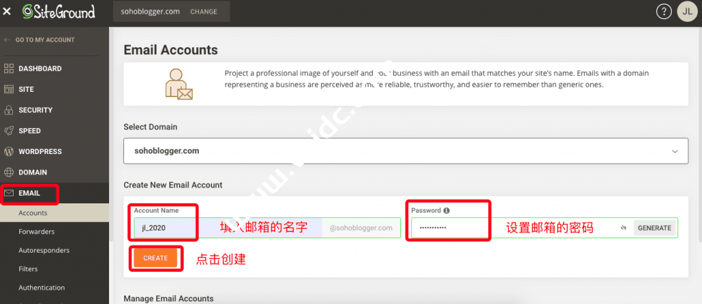 首先登录Siteground后台创建邮箱,还没有购买Siteground的小伙伴可以点击这里按教程步骤购买。