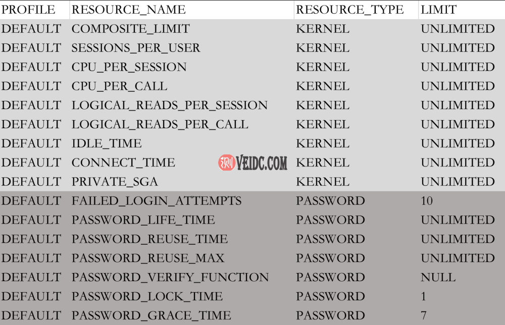SELECT t.* FROM dba_profiles t WHERE t.profile = 'DEFAULT';