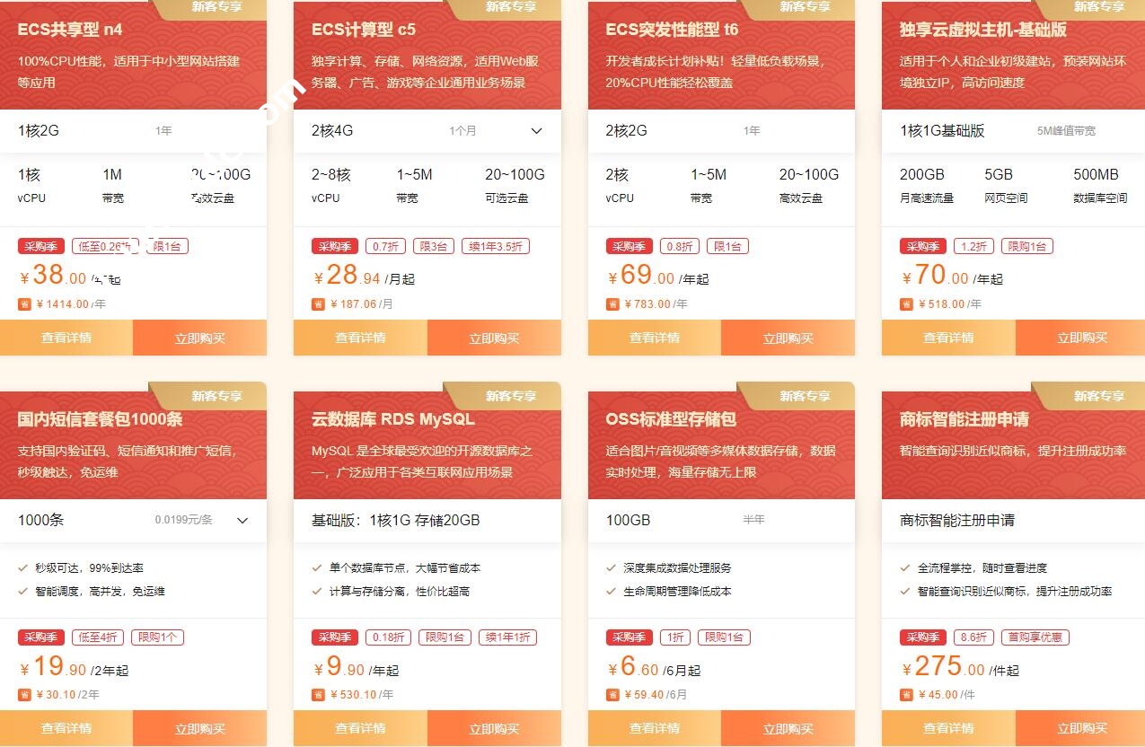 今年阿里云新春采购季活动发布的有点晚,腾讯云都已经发布超过半个月居然阿里云今天才发布。既然发布我们就一起看看阿里云的开年上云活动有哪些福利力度,从活动的策划看品种还是蛮多的,比如有满减优惠券领取、新客云服务器优惠低至年服务器38元这个和腾讯云相似。同时还有团购拼团活动、新老用户优惠活动,包括企业活动、智能硬件产品等。
