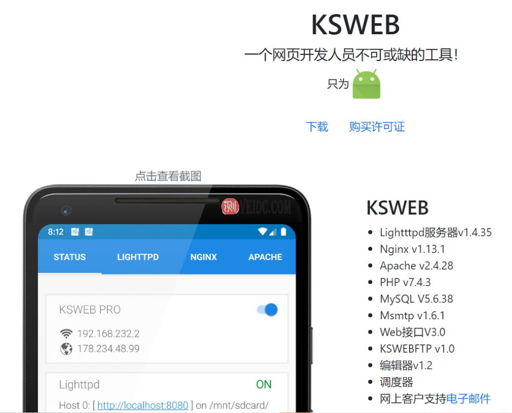 首先大家需要一台旧手机(新手机也不是不行),下载KSWEB,KSWEB是一款由俄罗斯人开发的基于Android的开源服务器,使用lighttpd、nginx、apache、php、sql可以使你的安卓手机瞬间变成一台服务器,并且兼容多数主流PHP程序。