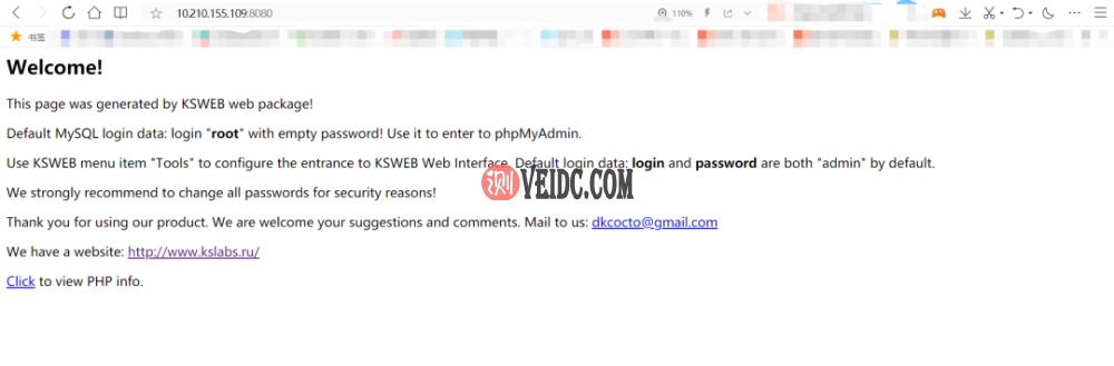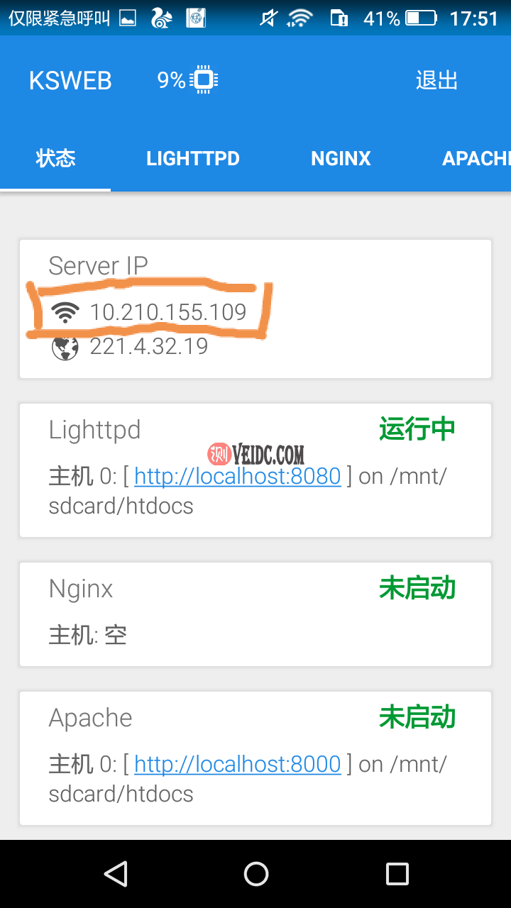 然后打开KSWEB,我们的局域网Web IP会自动生成,我们可以打开浏览器测试一下这个IP地址是否成功搭建。