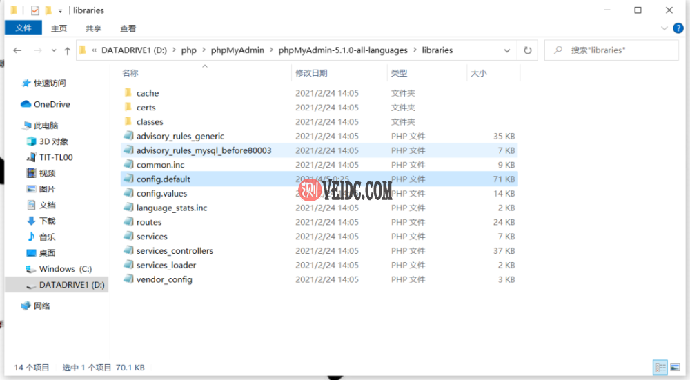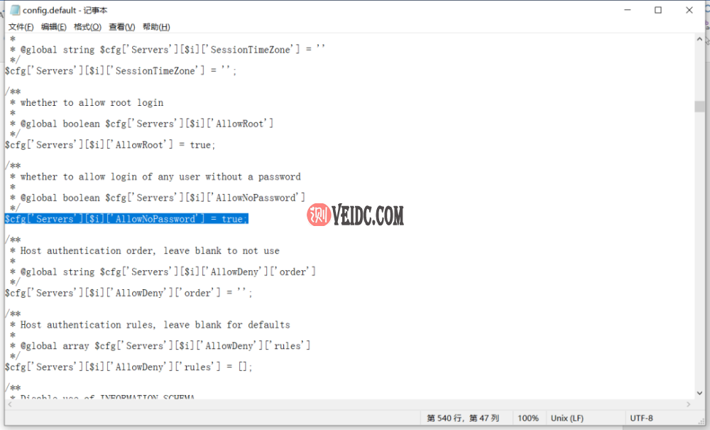 在本次分享中,我们使用phpMyAdmin作为Web管理系统(可在百度下载),下载后解压,在libraries文件中找到config.default搜索“AllowNoPassword”,并修改false为true。(这样配置后的原始管理页面才能不用密码登录)