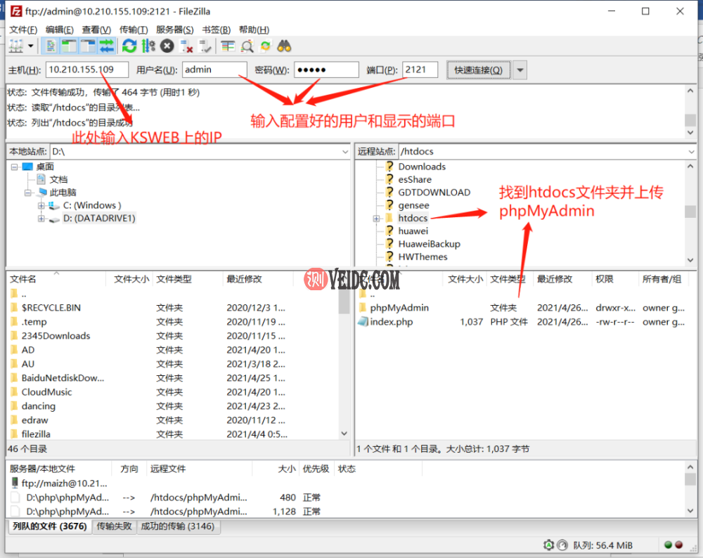 修改好源码后,把phpMyAdmin文件传输到手机的htdocs文件夹中(即服务器的文件夹),此处小编使用FileZilla通过局域网使用ftp协议进行无线传输,也可以使用数据线直接传输到手机。
