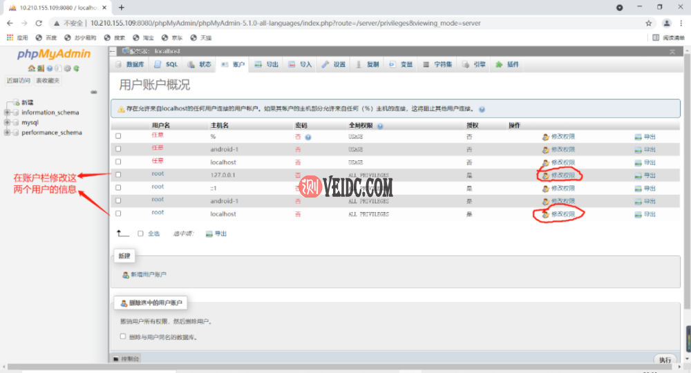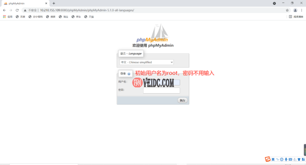 在浏览器进入网页,用初始账号root进入管理页面,修改两个账户的密码,phpMyAdmin的配置就完成了。