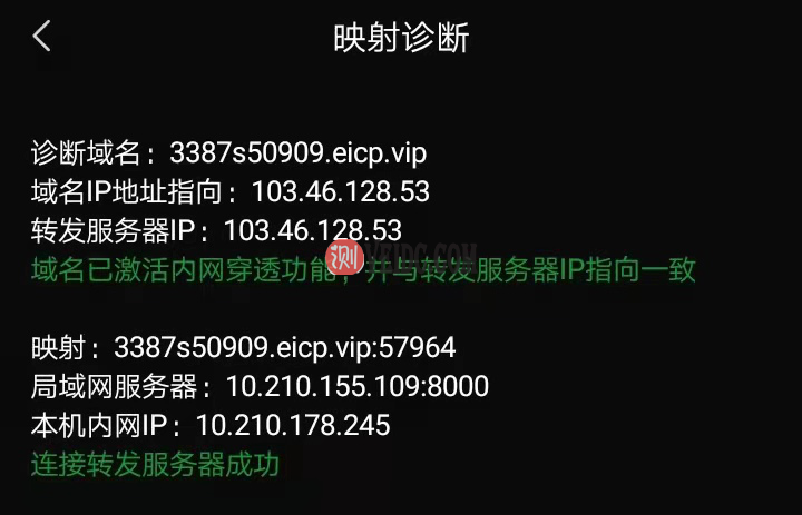 下载花生壳APP,登录后添加映射,选择HTTP映射,输入主机IP和对应端口(与前面一样,可在KSWEB上查看),然后添加映射,如图显示诊断成功后,即可实现内网穿透。