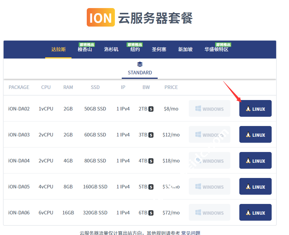 | 2G | 2核 | 60G | 3T/月 | $37.10/季 | Linux | Windows |