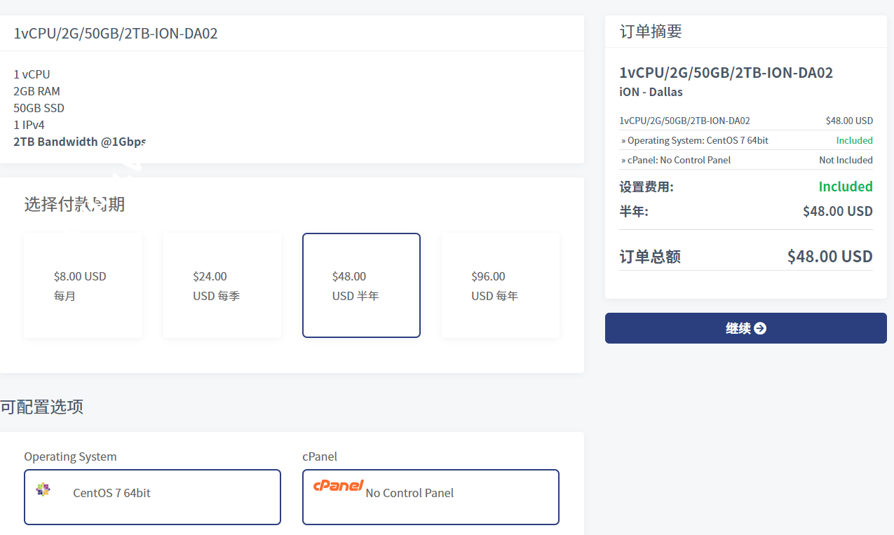 然后选择付款周期,选择操作系统,点击“继续”按钮进入下一步: