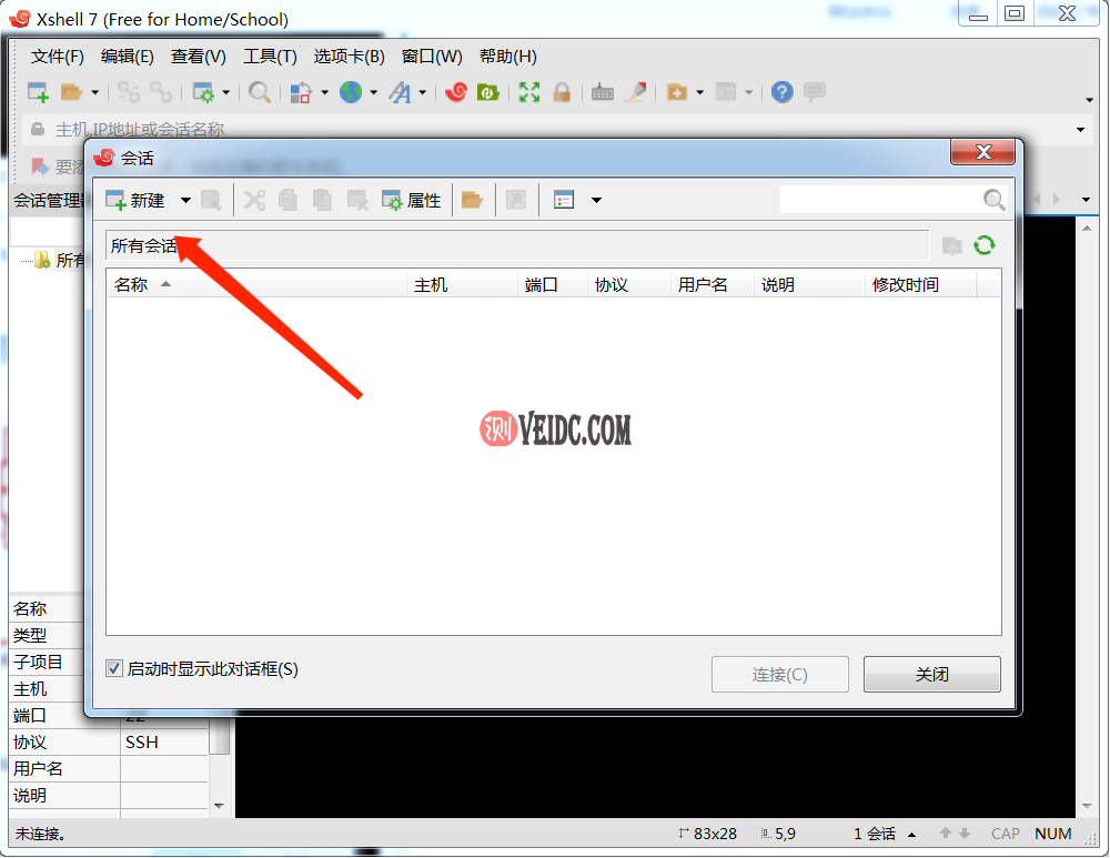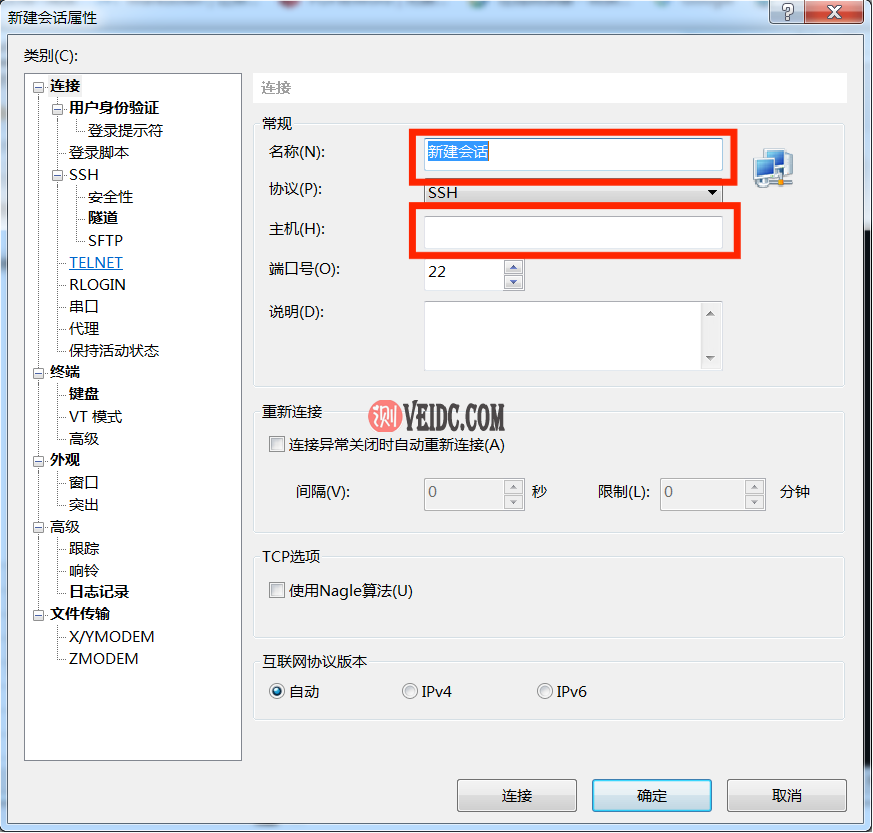 然后弹出新建会话,”名称”按自己需要备注;”协议”就默认SSH;主机填写服务器的 IP 地址;端口通常是默认的 22 ,但也有很多商家为了安全是非标准端口,比如搬瓦工、博鳌云的马来西亚VPS等。这就需要填写商家给的端口。