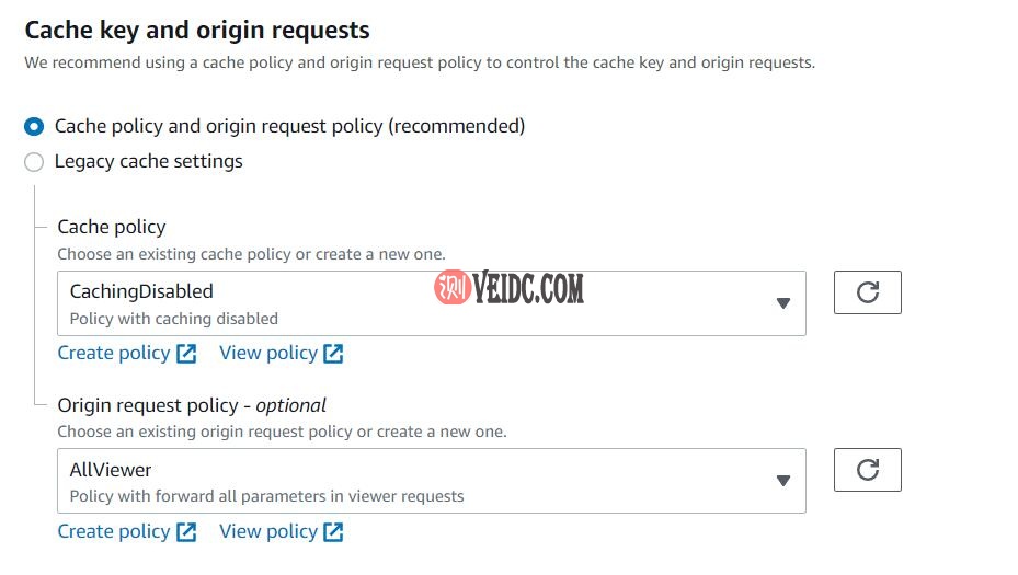 第二条是缓存设置和源请求设置Cache key and origin requests,作为默认规则建议分别选择CachingDisabled禁止缓存以及AllViewer将所有访客请求头转发到源站。