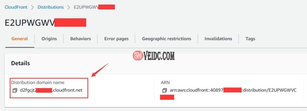 这时候一个CDN资源就成功创建出来了,稍后你可在面板上看到为你分配的*.cloudfront.net默认域名,这也是你后续添加自定义域名所要指向的CNAME值。