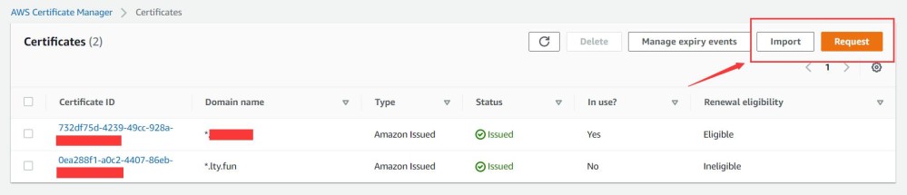 随后同样是比较重要的HTTPS配置,我们先要前往us-east-1可用区的ACM(点击前往)导入自己的证书或者签发Amazon的免费证书,注意这里必须是Virginia区域的ACM否则CloudFront将无法读取到你的证书。点击Import导入自己证书,Requst签发免费证书。