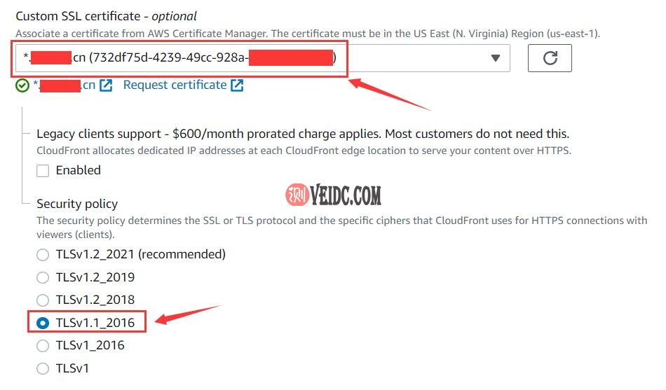 准备好证书后回到我们的CDN设置页面,在Custom SSL certificate选项卡下选择你刚刚签发的证书,安全策略建议选择TLSv1.1_2016以获得较为广泛的兼容性。