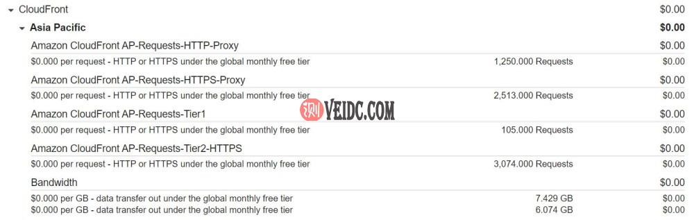 使用CloudFront需要注意自己是否超出免费额度,超出后的价格是很贵的。账单是每天出一次,没有实时统计提供(控制面板的流量统计也有几个小时延迟),因此请不要将其用于易受攻击的站点。