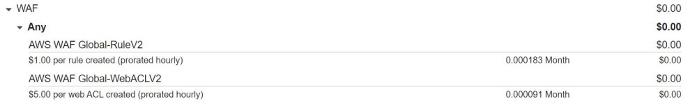 CloudFront提供有WAF防护,在前文未提到的原因是它是付费的而且价格并不便宜,因此并不推荐使用。以设置一条访问速率限制规则为例,你需要每月支付5美金的WAF规则费用以及1美元/条用于限流的ACL规则,此外还有请求次数的费用。